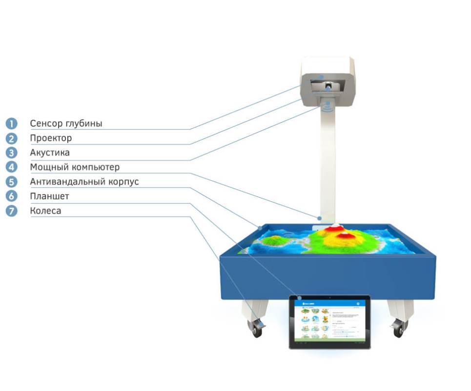 Планшет для управления: Для удобного управления интерактивной песочницей и выбора игровых сценариев используется планшет. На планшете пользователь может выбирать различные эффекты, настраивать параметры игры и взаимодействовать с песочницей.