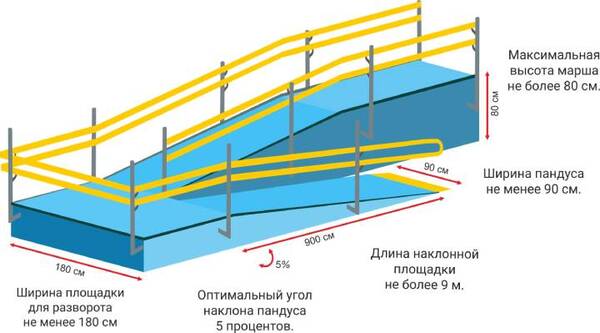 - Пандус более 12 м — максимально безопасен уклон 3%, дополнительно обязательны горизонтальные участки для отдыха.