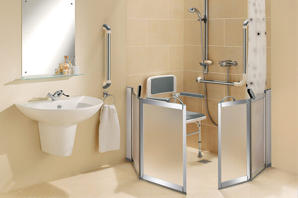 Душ без бортика с уклоном в сторону трапа — оптимальный вариант. Важно предусмотреть складное сиденье (размеры ~48×85 см), поручни по периметру и противоскользящее покрытие. Зона должна быть доступна для въезда на коляске.
