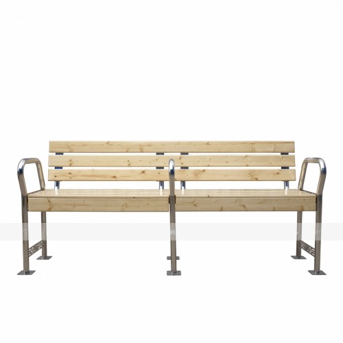 Скамья со спинкой и тремя завышенными подлокотниками - универсальное уличное изделие, которым может воспользоваться любой человек, а ее высокие подлокотники служат дополнительной опорой для людей с ограничениями по здоровью. Основание скамьи изготавливается из нержавеющей стали марки AISI 304, что позволяет использовать изделие в условиях агрессивной городской среды.