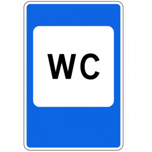 Местонахождение общественного туалета. Устанавливаются в непосредственной близости от обозначенного объекта или при приближении к нему (расстояние до объекта указывается на синем поле знака).