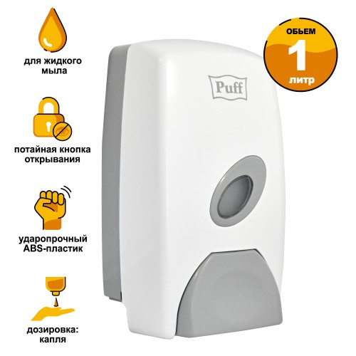 Дозатор для жидкого мыла Puff-8115 на 1000 мл - простой дозатор в пластиковом корпусе впишется практически под любой дизайн, а большая плавная кнопка повышает удобство использования дозатора. Прозрачное стекло позволяет контролировать остаток жидкого мыла.