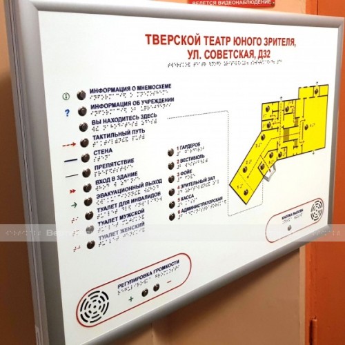 Тактильно-звуковая мнемосхема на данный момент является самым оптимальным средством адаптации различных объектов инфраструктуры, предусматривающих пребывание людей с нарушением зрения. Ввиду того, что изучение информации путём ощупывания букв, занимает продолжительное время и не способствует быстрому запоминанию расположения объектов, специалистами компании были разработаны мнемосхемы, с встроенной системой воспроизведения тифлокомментариев, что в значительной мере облегчает восприятие информации и делает устройство максимально доступным для людей с различным уровнем натренированности чтения тактильной информации как по системе Брайля, так и плоско-выпуклых элементов. Также в корпус устройства интегрирована кнопка вызова помощи и индукционная система.