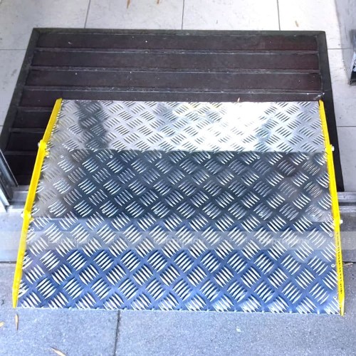 Пандус перекатной с упором на порог, предназначен для преодоления дверных порогов и небольших перепадов высот, кабелей и прочих выступов детскими и инвалидными колясками, также предназначен для беспрепятственного передвижения инвалидов как в помещениях, так и на улице. Грузоподъемность модели до 250 кг. Благодаря наличию противоскользящего рифления гарантируется отличное сцепление металла с резиновыми колесами. Данный пандус является мобильным устройством, что позволяет применять его в различных местах с одинаковой высотой преград.