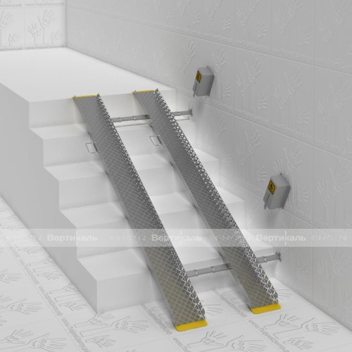 Пандус откидной двухколенный предназначен для подъездов жилых домов, узких лестничных маршей. Данная конструкция используется как временная адаптация помещений, до проведения капитального ремонта. Данная конструкция в сложенном состоянии не мешают повседневному подъему и спуску по лестнице. Пандус крепится на петли. Пандус оборудован ручками, что позволяет легко сложить и разложить его при необходимости. В разложенном виде пандус опирается на каждую ступеньку лестницы, что позволяет равномерно распределить нагрузку при использовании, в сложенном виде пандус фиксируется на защелку вдоль перил/стены.