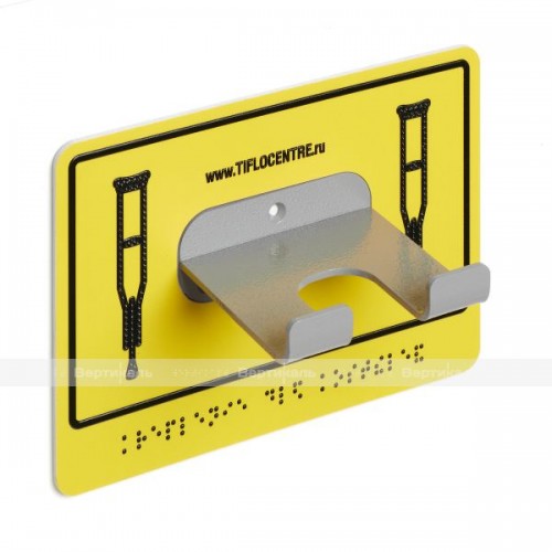 Универсальный травмобезопасный крючок-держатель предназначен для крепления одновременно 2-х костылей или трости. Для слабовидящих — держатель трости контрастно выделяется в интерьере яркой пиктограммой, а для тотально незрячих дополнительно нанесены рельефные надписи с применением системы Брайля.