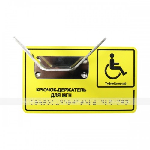 Крючок для костылей, трости, одежды, полотенец из нержавеющей стали представляет собой крючок из нержавеющей стали в виде двух направленных вверх рожков и инкрустированный в тактильную табличку из ПВХ. На контрастную тактильную табличку нанесена рельефная надпись с применением системы Брайля, нанесённая послойно-полимерным способом.