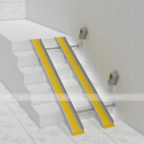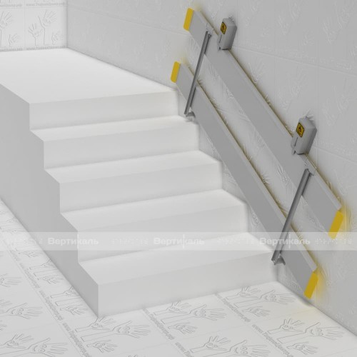Пандус откидной двухколенный предназначен для подъездов жилых домов, узких лестничных маршей. Данная конструкция используется как временная адаптация помещений, до проведения капитального ремонта. Данная конструкция в сложенном состоянии не мешают повседневному подъему и спуску по лестнице. Пандус крепится на петли. Пандус оборудован ручками, что позволяет легко сложить и разложить его при необходимости. В разложенном виде пандус опирается на каждую ступеньку лестницы, что позволяет равномерно распределить нагрузку при использовании, в сложенном виде пандус фиксируется на защелку вдоль перил/стены.