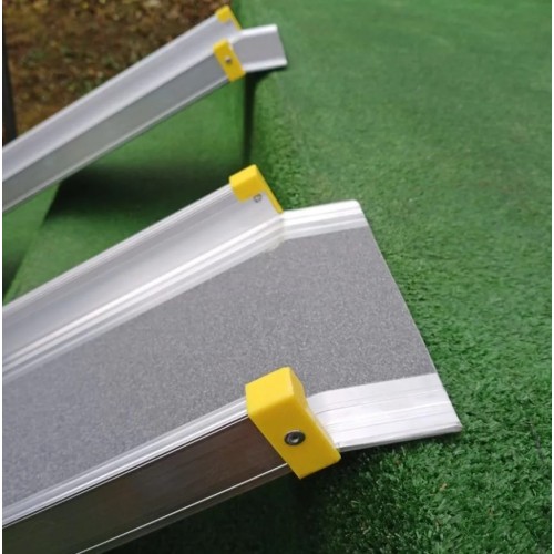 ✔ 2. Защитные бортики с безопасными контрастными заглушками, наличие фиксатора пандуса в рабочем состоянии и противоскользящее абразивное покрытие в 3 цветах. Плюсы последней характеристики особо заметны будут при использовании пандуса на крутых подъемах и спусках.