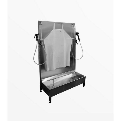 Фартук закрепляется на передней панели установки посредством зажимов и мойка осуществляется при помощи пистолета - разбрызгивателя и щетки.Загрязненная обувь ставится на подставку и также моется при помощи пистолета-разбрызгивателя либо щетки.