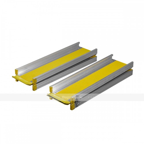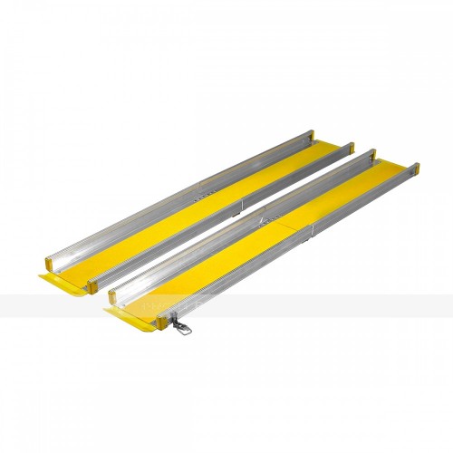 Рампы выполнены из высокопрочного алюминия. Площадки для въезда/съезда изготовлены из стали, толщиной не менее 2мм и окрашены порошково - полимерным способом. Рабочая сторона рамп оборудована бортиками безопасности и противоскользящей, влагоустойчивой лентой. Наличие площадок для свободного съезда/заезда, обеспечивает плавный переход на площадку и надёжную фиксацию при установке. Складной механизм по типу «книжка» обеспечивает удобную транспортировку и хранение. Конструкция рамп отличается легкостью и не требует специальной установки.