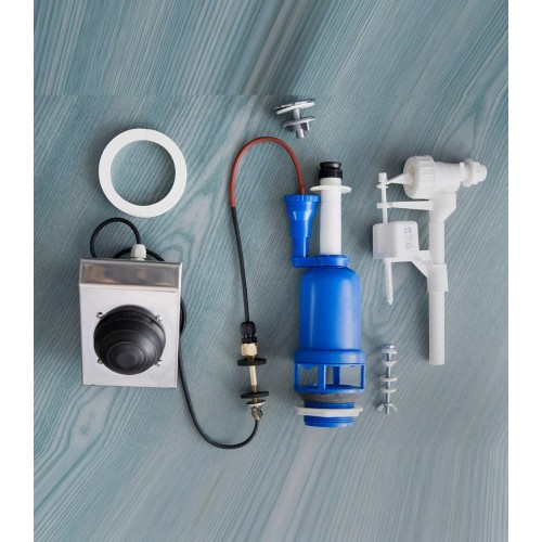 Педаль, в которую встроен насос, соединена с пневматическим исполнительным механизмом клапана бачка при помощи ПХВ трубки. Предлагаемый комплект содержит все необходимые компоненты для замены обычной арматуры сливного компакт-бачка.
