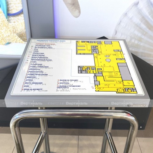 Горизонтальная стойка представляет собой конструкцию, корпус которой изготавливается из композитного алюминия и оргстекла с удобным для чтения углом наклона и устойчивой вертикальной основы выполненной из стали. Наличие опорного поручня обеспечивает свободный доступ к стойке всем категориям МГН. В виду тактильной безопасности на алюминиевом корпусе отсутствуют стыки на ребрах, а торцевые поверхности оргстекла отполированы и имеют закругленные углы, опорный поручень также является травмобезопасным, изготовлен без острых углов и имеет скруглённую зеркальную поверхность. Стойка предназначена для размещения тактильной мнемосхемы на социально-значимых объектах с целью подачи полной информации о взаимном расположении объектов, их название и иных сведений прямо или косвенно влияющих на безопасность незрячего или слабовидящего человека.