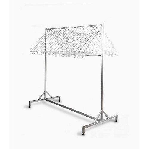 Стойка для сушки фартуков выполнена из профильных труб, имеет регулируемые опоры. Стойка по согласованию с Заказчиком может быть выполнена на 20 или 10 вешалок для фартуков.Комплектация: