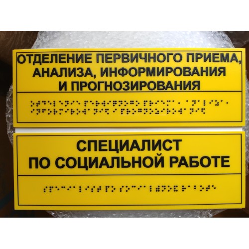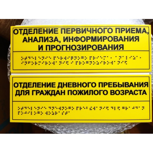 Тактильная информационная табличка предназначена для передачи информации для МГН со стойкими расстройствами функция зрения, владеющими техникой чтения рельефно-точечного шрифта Брайля (путем прикосновения к элементам шрифта Брайля), не владеющих данной техникой (путем прикосновения к выпуклым элементам кириллического шрифта) и слабовидящих (путем визуального восприятия контрастного сочетания цветов фона и кириллических надписей).