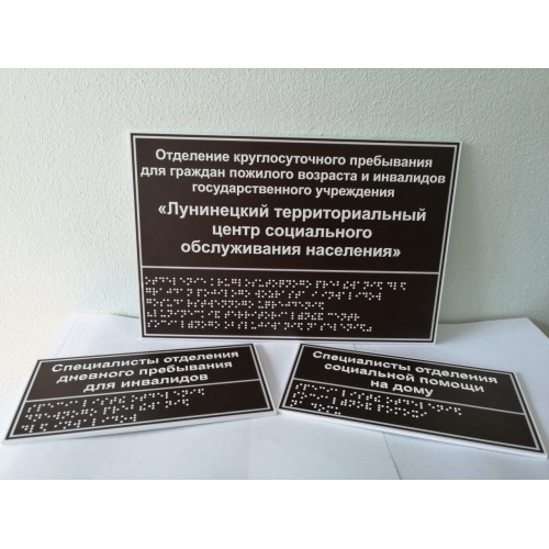 Тактильная информационная табличка предназначена для передачи информации для МГН со стойкими расстройствами функция зрения, владеющими техникой чтения рельефно-точечного шрифта Брайля (путем прикосновения к элементам шрифта Брайля), не владеющих данной техникой (путем прикосновения к выпуклым элементам кириллического шрифта) и слабовидящих (путем визуального восприятия контрастного сочетания цветов фона и кириллических надписей).