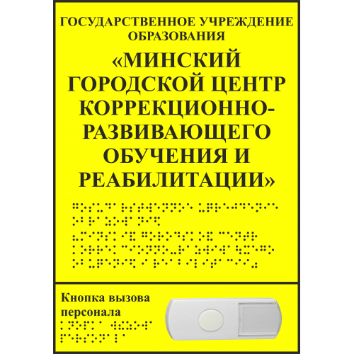 Тактильная вывеска размером А3 с дублированием информации шрифтом Брайля, совмещенная с беспроводной системой вызова.