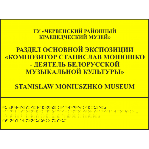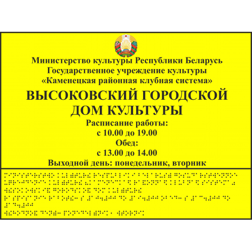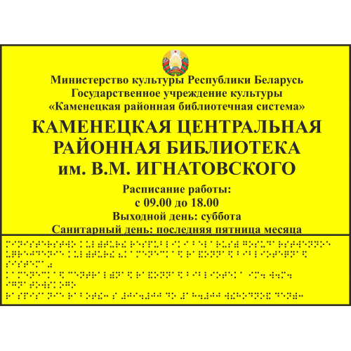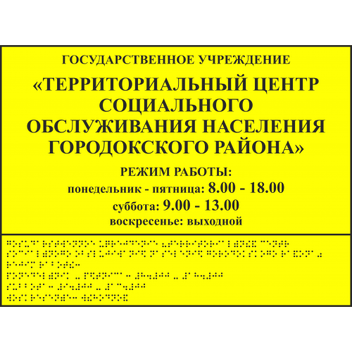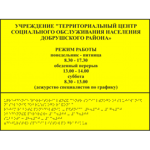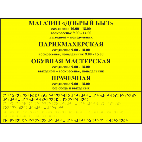 Комплексная тактильная информационная вывеска с наименованием и режимом работы организации предназначена для передачи информации для МГН со стойкими расстройствами функция зрения, владеющими техникой чтения рельефно-точечного шрифта Брайля (путем прикосновения к элементам шрифта Брайля), не владеющих данной техникой (путем прикосновения к выпуклым элементам кириллического шрифта и символьных пиктограмм) и слабовидящих (путем визуального восприятия контрастного сочетания цветов фона и кириллических надписей, символьных пиктограмм). Устройство легко монтируется на любую поверхность и готово к использованию сразу после установки.