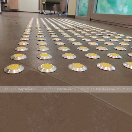 Комбинированные индикаторы с пирамидальной рифлёной вставкой. Данное изделие предназначено для оборудования объектов c целью обеспечения беспрепятственного и безопасного передвижения маломобильных групп населения с нарушением зрения.