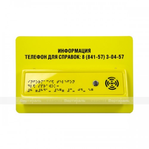 Данный вид настенной таблички является универсальным, так как включает в себя три способа получения информации: зрительный, слуховой и тактильный. Благодаря речевому информатору (кнопка слева), табличкой смогут воспользоваться тотально незрячие люди, не владеющие системой Брайля. Такой вид табличек может применяться на дверях медработников, госслужащих, педагогов и в других общественных учреждениях.