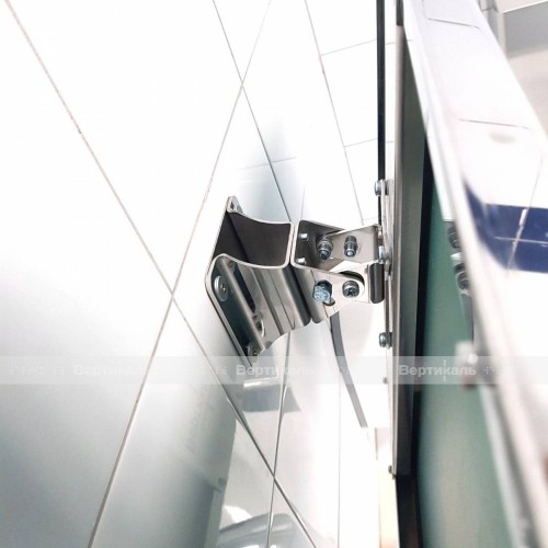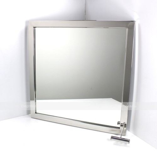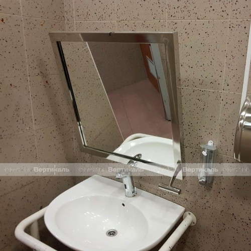 Изделие представляет собой зеркало с каркасом из нержавеющей стали оборудованное поворотным механизмом. Наличие рукоятки даёт возможность людям в инвалидных креслах самостоятельно регулировать угол наклона для беспрепятственного использования изделия по назначению. Зеркало характеризуется долгим сроком службы и повышенной безопасностью. В общественных туалетах с высокой проходимостью нередко возникают случаи деформации стекла, что приводит к травмам. Поворотное зеркало изготавливается по специализированной технологии с армированием обратной стороны изделия специальной пленкой, которая при разбитии стекла не дает осколкам разлетятся. Зеркало характеризуется долгим сроком службы и повышенной безопасностью.