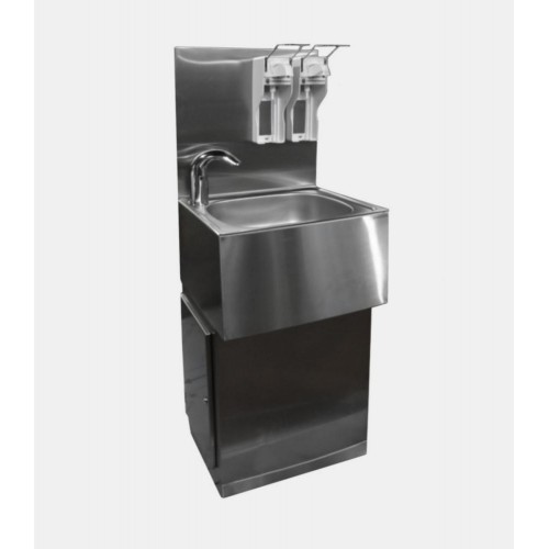 В процессе исключается контакт загрязненных рук с элементами конструкции. Это достигается применением локтевых дозаторов жидкого мыла и дезраствора, а также фотоэлектрического датчика включения воды. Включение подачи воды осуществляется при внесении рук в зону мойки. Кран снабжен антивандальной системой.Конструкция: